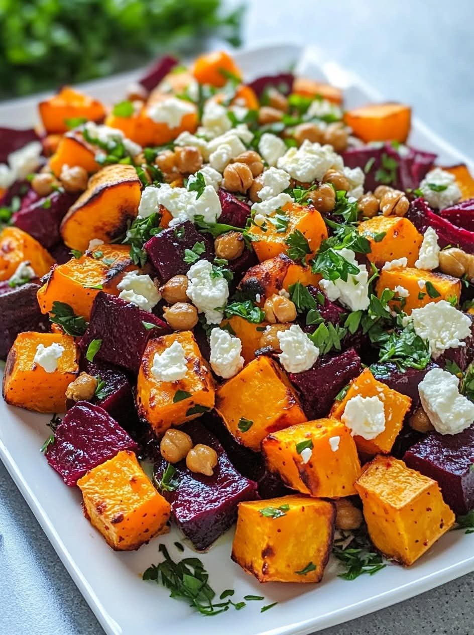 This salad is a vibrant, hearty, and flavour-packed dish. Earthy beetroot and sweet potato are roasted until caramelized, paired with spiced roasted chickpeas (seasoned with smoked paprika) for a crunchy, smoky contrast. Crumbled feta adds creaminess and tang, while a cool yogurt-based dressing ties everything together. It’s great served warm, at room temperature, or even chilled — ideal as a side or a light main.