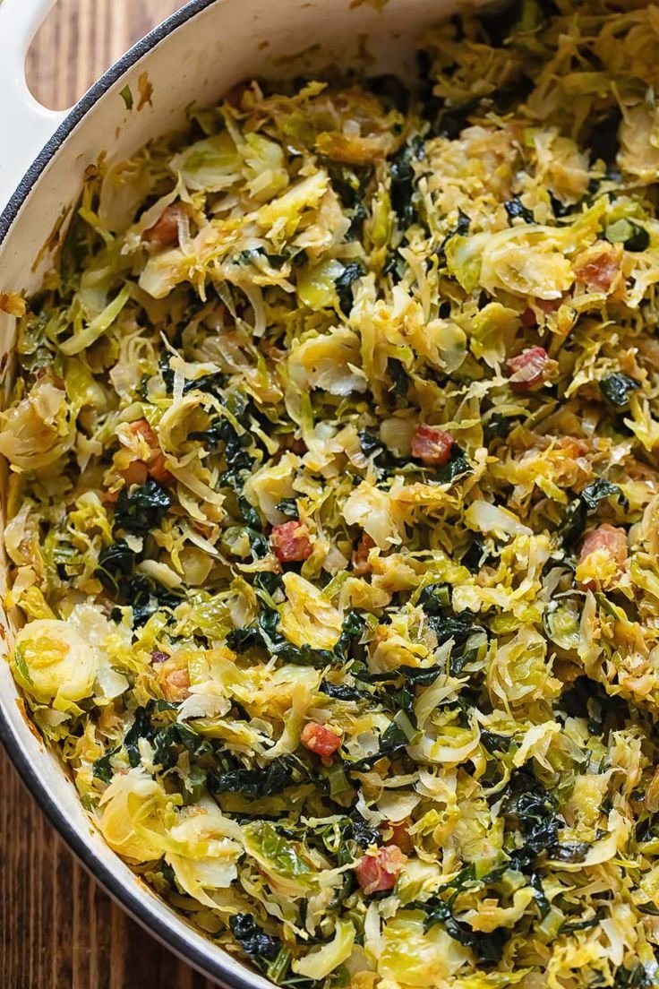 Shredded Brussels sprouts cooked until deeply caramelized with sweet leeks and crisp, salty pancetta. The combination creates a rich, savory hash that’s perfect with eggs, roasted chicken, or holiday meals.