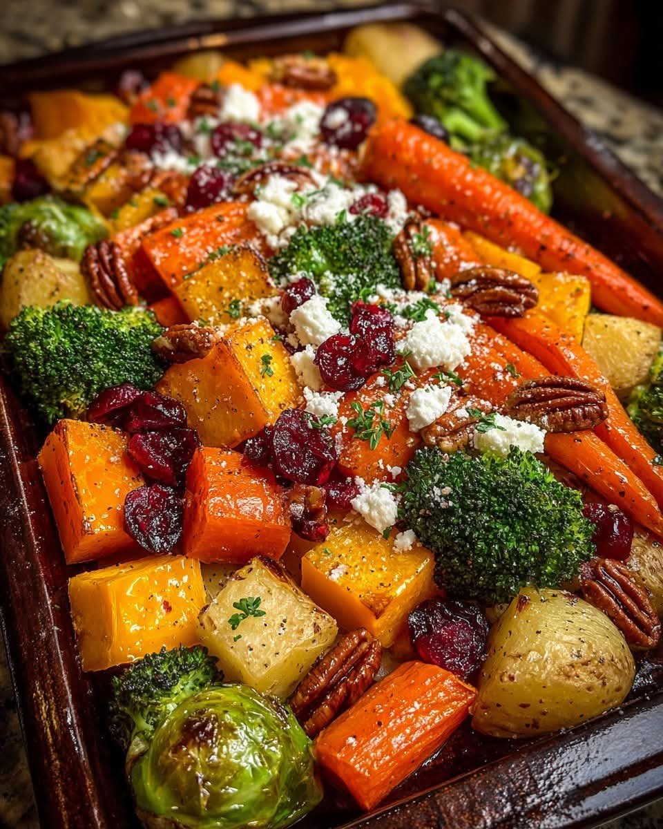 This vibrant roasted vegetable medley balances sweet, savory, and tangy flavors. Tender caramelized butternut squash, golden carrots, broccoli, and Yukon potatoes are topped with creamy feta, toasted pecans, and a luscious cranberry-honey glaze. Perfect as a hearty side dish for holiday dinners, weeknight meals, or even as a vegetarian main with a grain like quinoa or farro.