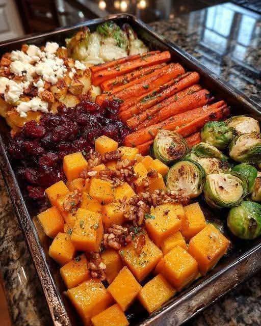A cozy, nutrient-packed roasted vegetable dish with sweet caramelized edges, tangy feta, crunchy walnuts, and a rich cranberry-honey glaze. Perfect as a holiday side or healthy main.