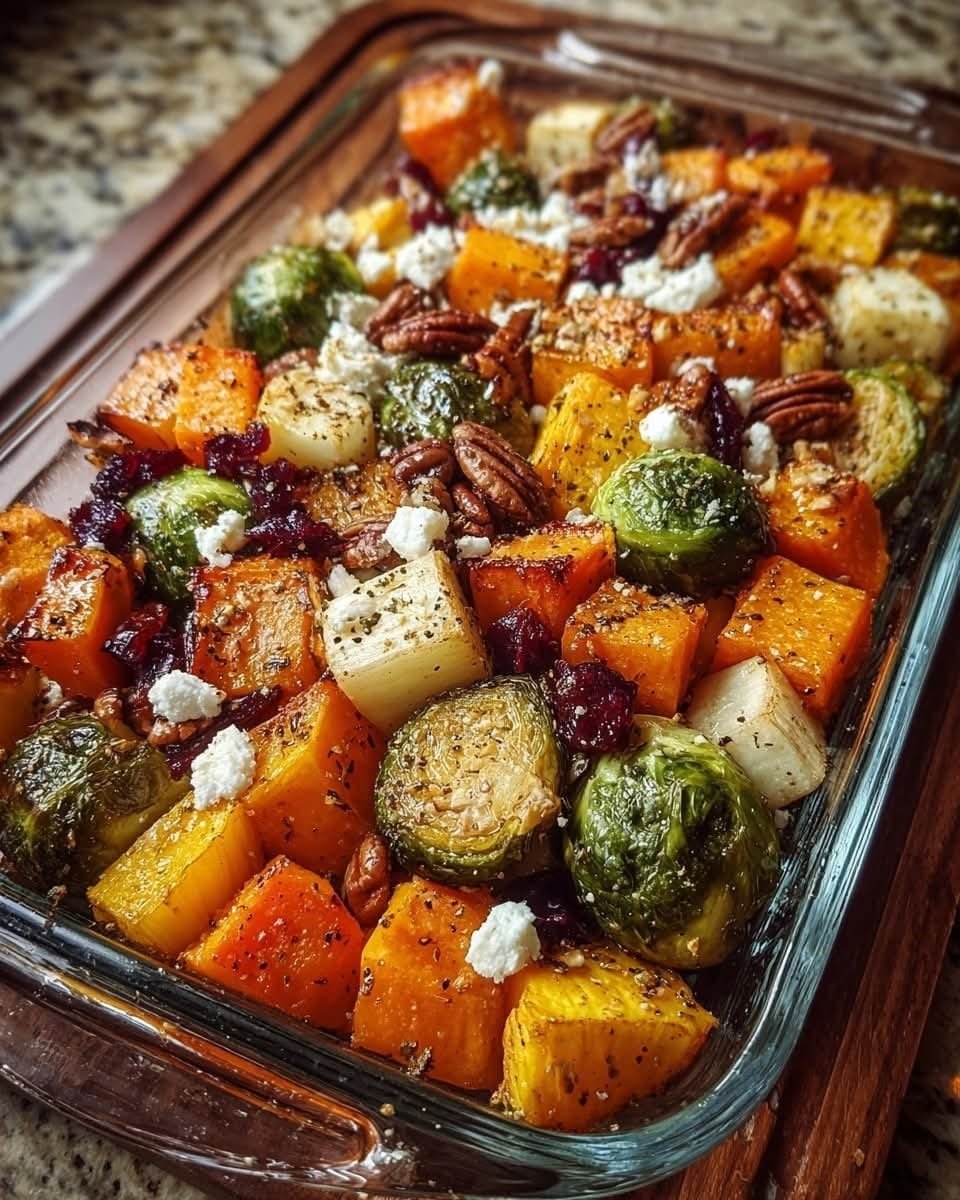 This recipe brings together warm roasted vegetables, crunchy pecans, creamy feta, and a sweet-tangy glaze that ties everything together. The combination of squash, parsnips, sprouts, and sweet potato gives you a wide range of textures and flavors in every bite. It looks beautiful on the table and works equally well as a centerpiece or a side. The glaze adds brightness without overpowering the natural sweetness of the vegetables, and the feta balances everything with a salty kick.