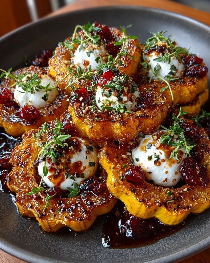 This dish combines roasted, caramelized delicata squash with creamy burrata, topped with a sticky-sweet cranberry honey glaze. The flavors balance beautifully — warm squash, tart cranberries, floral honey, and the cool richness of burrata. It looks elegant but is very simple to make.