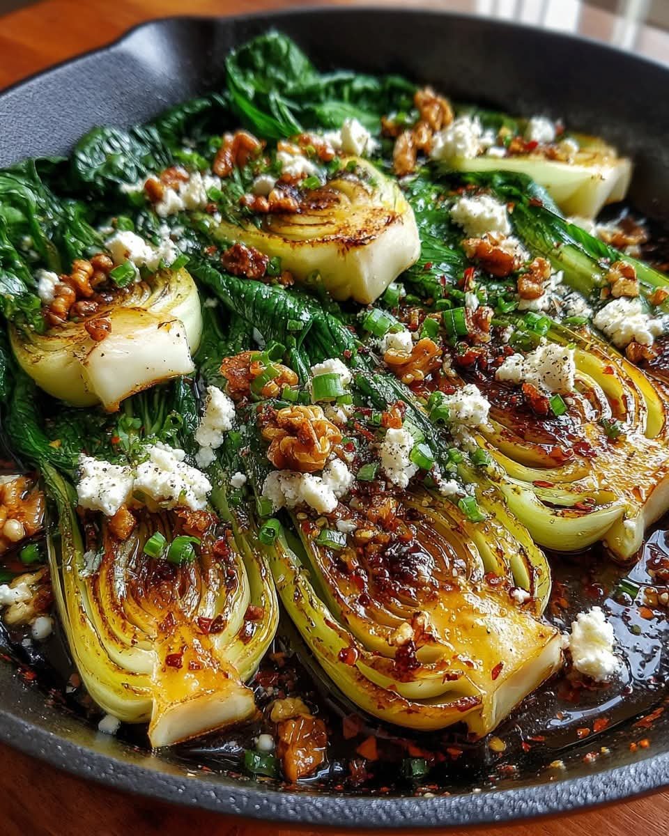 Caramelized Garlic Bok Choy with Feta, Walnuts & Hot Honey Drizzle is a flavorful, restaurant-style vegetable dish that balances sweet, savory, creamy, and crunchy elements. Tender bok choy is pan-seared with golden garlic, then topped with tangy feta, toasted walnuts, and a spicy-sweet hot honey drizzle. It works beautifully as a healthy side dish or a light vegetarian main.