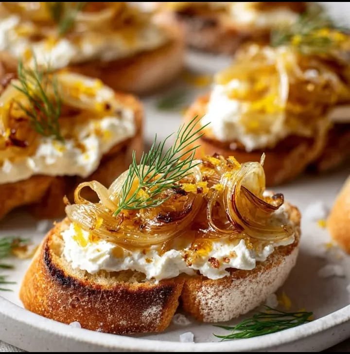 This bruschetta is a perfect blend of sweet, savory, and creamy flavors. Golden, caramelized onions sit atop a layer of smooth cream cheese on crispy toasted baguette slices, finished with a sprinkle of fresh herbs. It’s an elegant appetizer for dinner parties, brunches, or casual snacking.