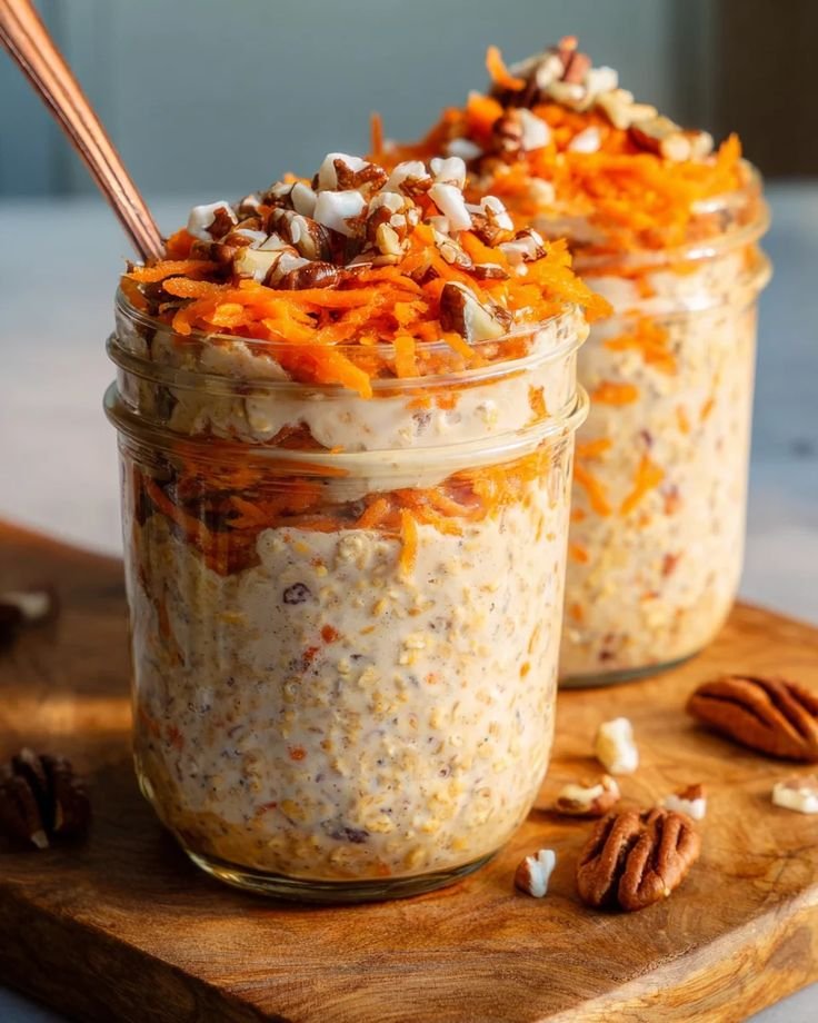 These Carrot Cake Overnight Oats are a wholesome, no-cook breakfast that tastes like dessert but fuels your morning. Rolled oats soak overnight with shredded carrots, warm spices, and creamy yogurt or milk, creating a soft, flavorful, and nutrient-packed breakfast. Topped with nuts and raisins, it’s a perfect grab-and-go meal.
