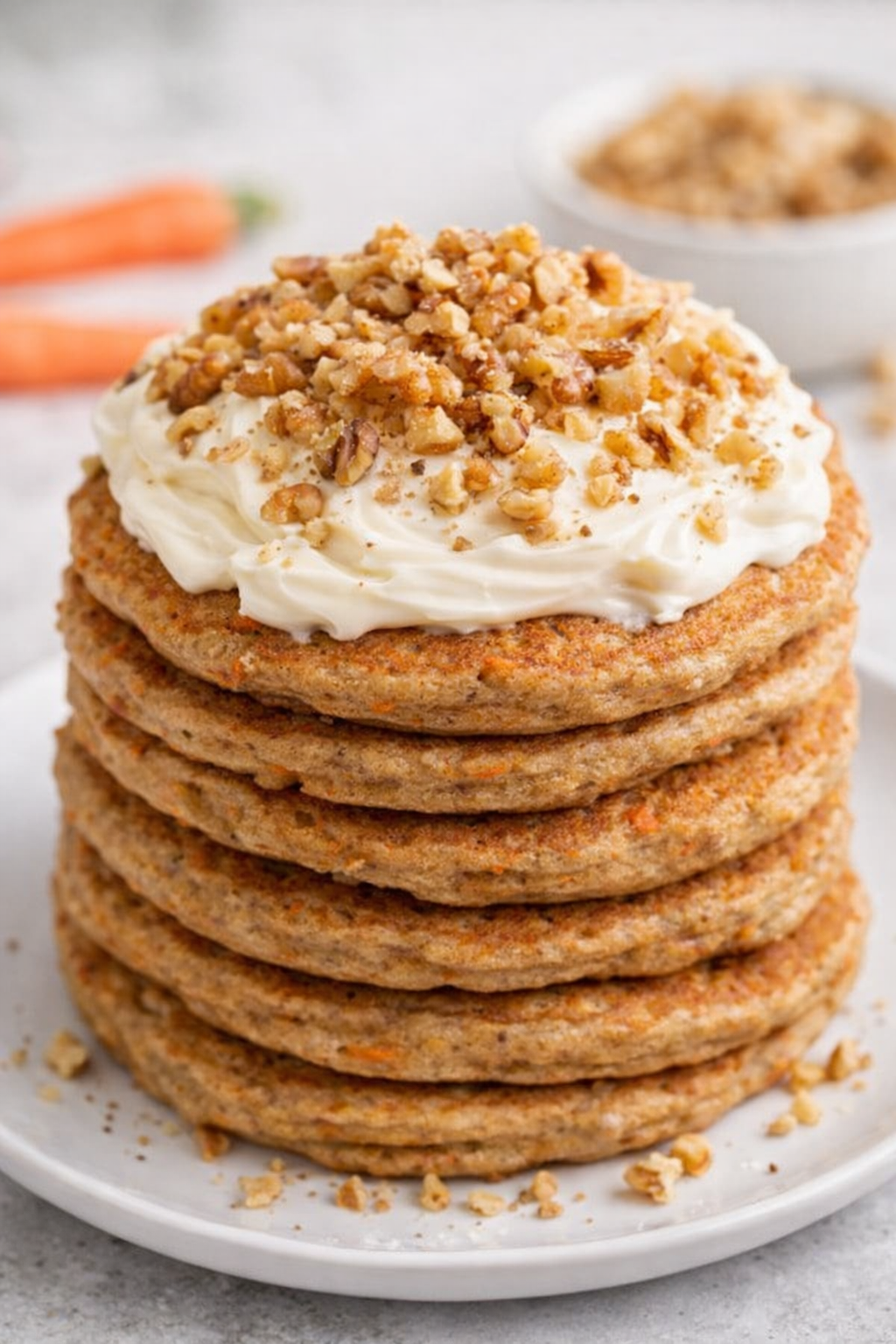 These are soft, fluffy carrot cake–inspired pancakes packed with warm spices, shredded carrots, and topped with a rich cream cheese frosting and crunchy nuts. Perfect for a cozy breakfast or dessert-style brunch.