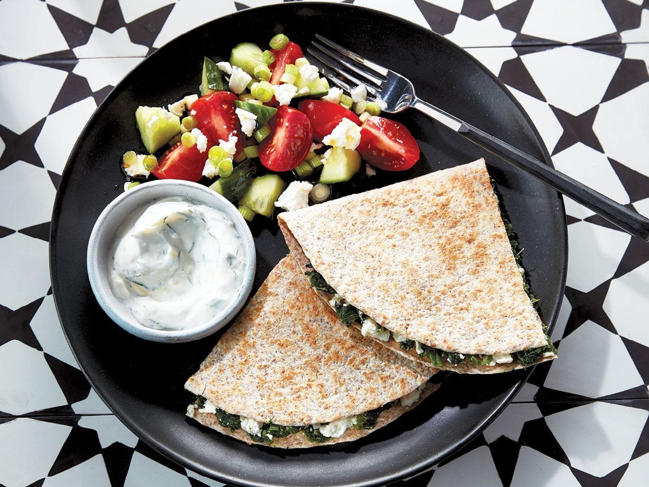 Spanakopita quesadillas with Greek salad