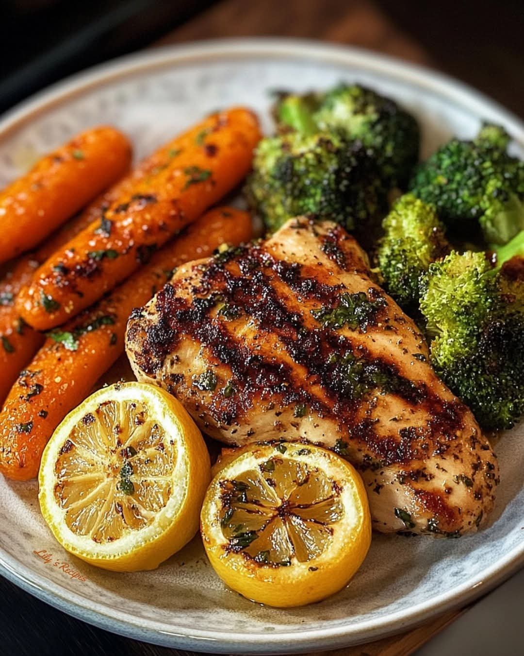 Grilled lemon herb chicken with carrot and broccoli