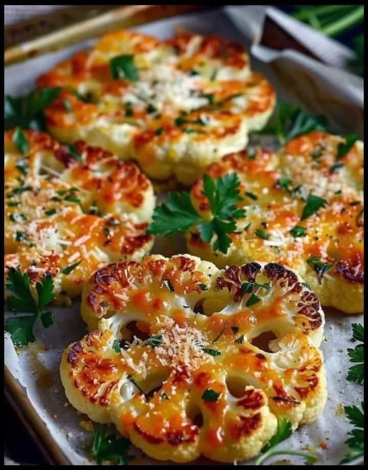 Thick-cut cauliflower “steaks” breaded and baked to a crispy golden brown, topped with melted parmesan cheese!