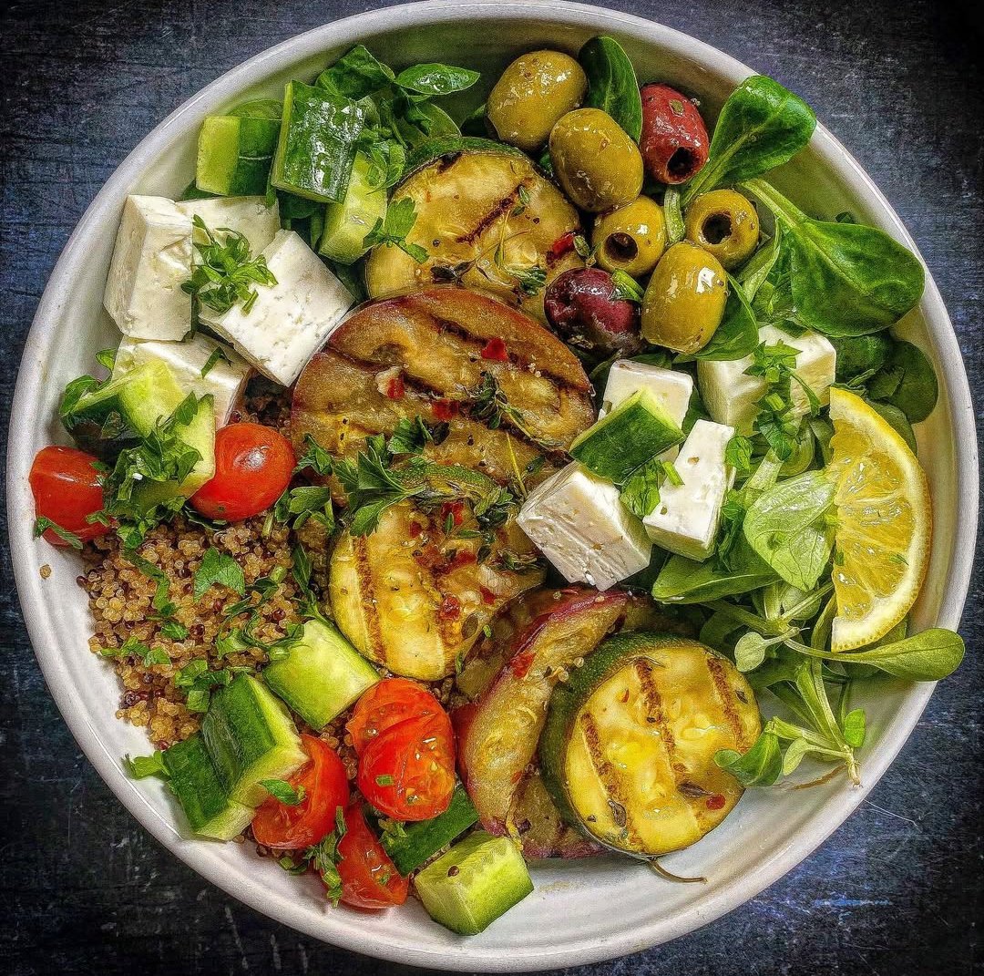 A vibrant bowl featuring chargrilled seasonal vegetables like zucchini, bell peppers, and eggplant, served over a base of grains or greens, drizzled with herby olive oil and lemon dressing, and topped with crumbled feta or tahini. Perfect for a healthy lunch, dinner, or meal prep.