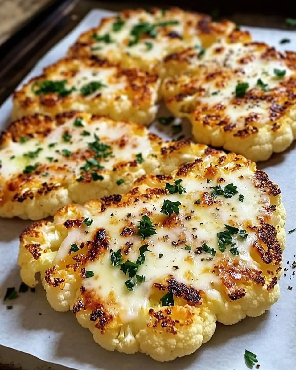 Thick slices of cauliflower are roasted until golden and tender, then topped with melted cheese and flavorful seasonings. This low-carb, vegetarian-friendly dish is packed with fiber, vitamins, and a satisfying cheesy crunch. Serve it as a main dish or a hearty side!