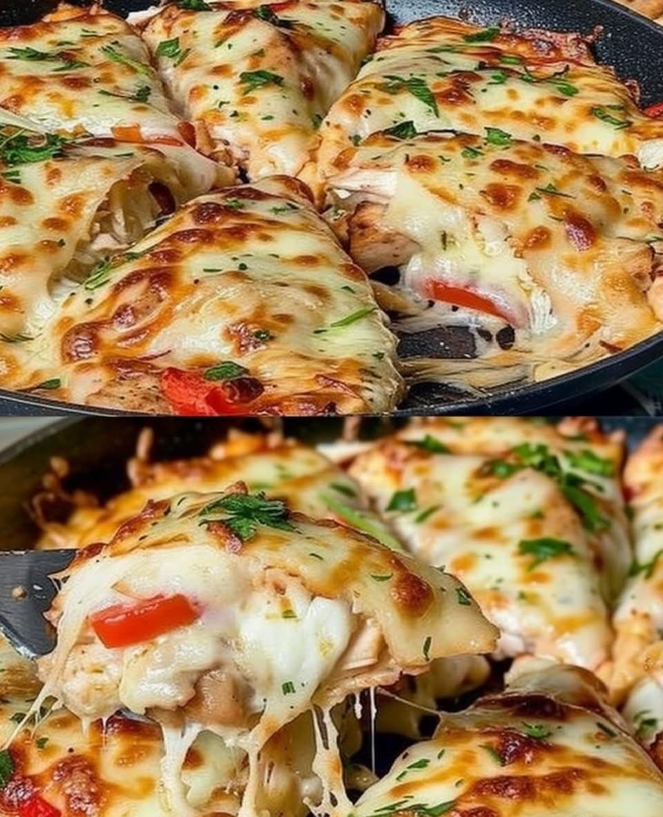 This dish features chicken breasts or thighs, along with vegetables like broccoli, bell peppers, and carrots, topped with a cheesy sauce made from melted cheese, cream, and seasonings. It’s baked until golden and bubbly, offering a hearty meal that’s perfect for dinner.