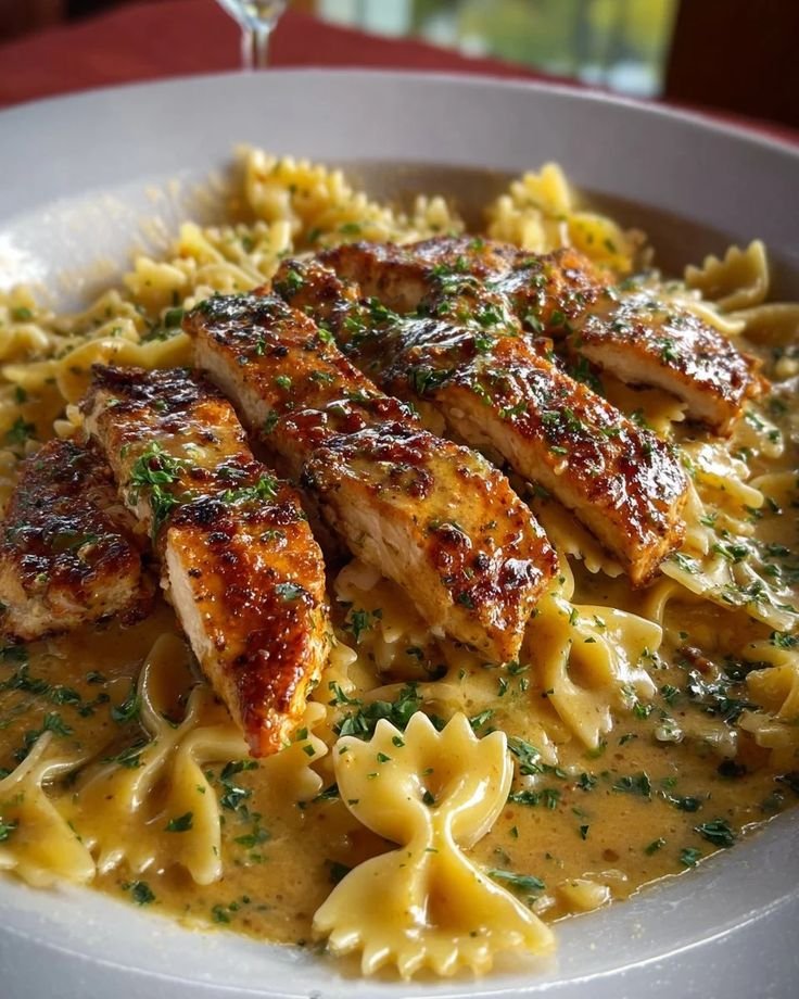 A creamy, cheesy pasta dish featuring tender chicken, bowtie (farfalle) pasta, garlic, Parmesan, and a touch of Cajun seasoning for warmth. Mild enough to suit Mediterranean flavors if you control the spice, but still rich and comforting.
