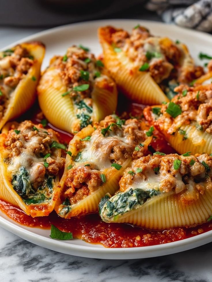 These Cheesy Ground Turkey & Spinach Stuffed Shells are cozy, creamy, and deeply satisfying—without feeling heavy. Tender jumbo pasta shells are filled with a savory mix of lean ground turkey, wilted spinach, and creamy cheeses, then baked in a light tomato sauce until bubbly and golden. It’s a family-friendly, non-spicy, Mediterranean-leaning comfort dish that’s perfect for meal prep or entertaining.