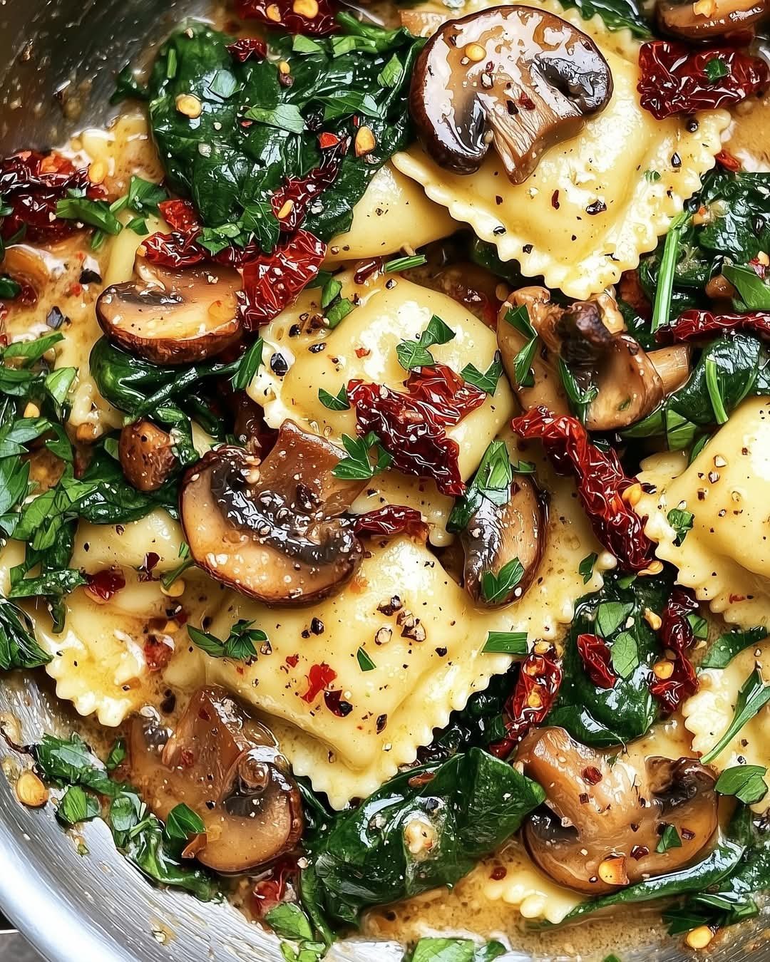 Cheesy Ravioli with Spinach, Mushrooms & Sun-Dried Tomatoes