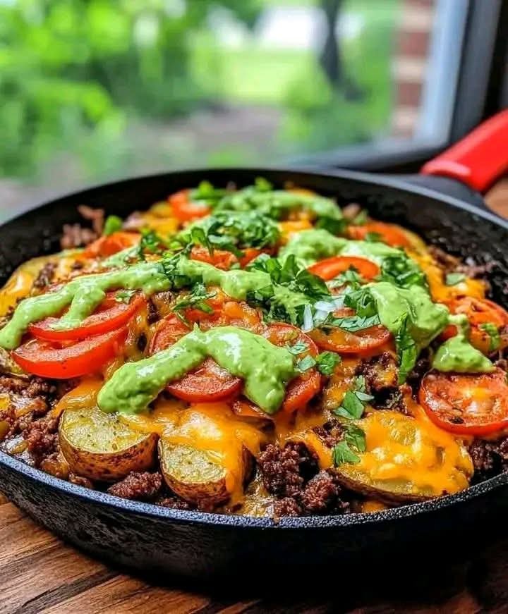 Comfort food meets bold Tex-Mex flavor in this Cheesy Taco Potato Skillet with Avocado Dressing. Juicy, spiced ground beef is sautéed with golden, pan-crisped potatoes and topped with melted cheddar cheese and cherry tomatoes—then finished with a creamy, herbed avocado drizzle for the perfect tangy finish.