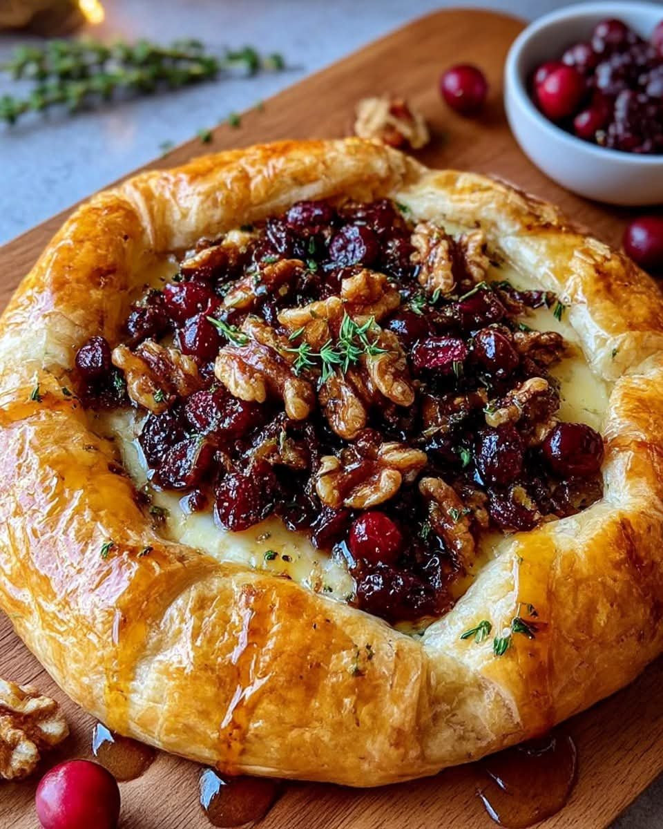 This elegant sweet-and-savory tart combines creamy melted Brie, tangy cranberries, and crunchy toasted walnuts, all wrapped in a buttery pastry crust. A warm drizzle of spicy hot honey ties everything together with a bold, irresistible finish. Perfect for holiday gatherings, brunch spreads, or a sophisticated appetizer.