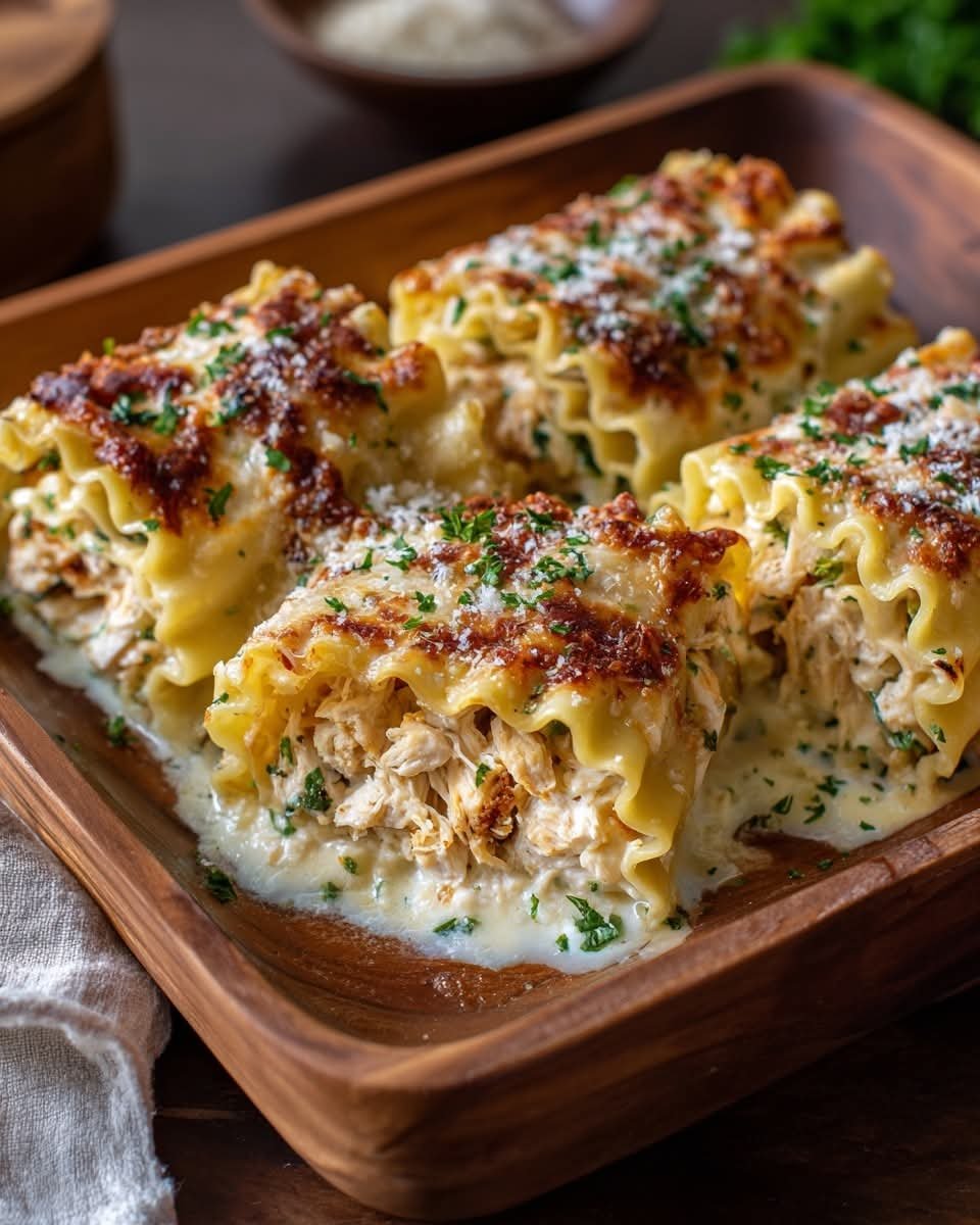 Lasagna noodles are filled with a savory mixture of shredded chicken, creamy ricotta, and mozzarella, then rolled up and baked in a luscious homemade (or store-bought) Alfredo sauce. Each roll is a perfectly portioned serving — great for family dinners or meal prep!