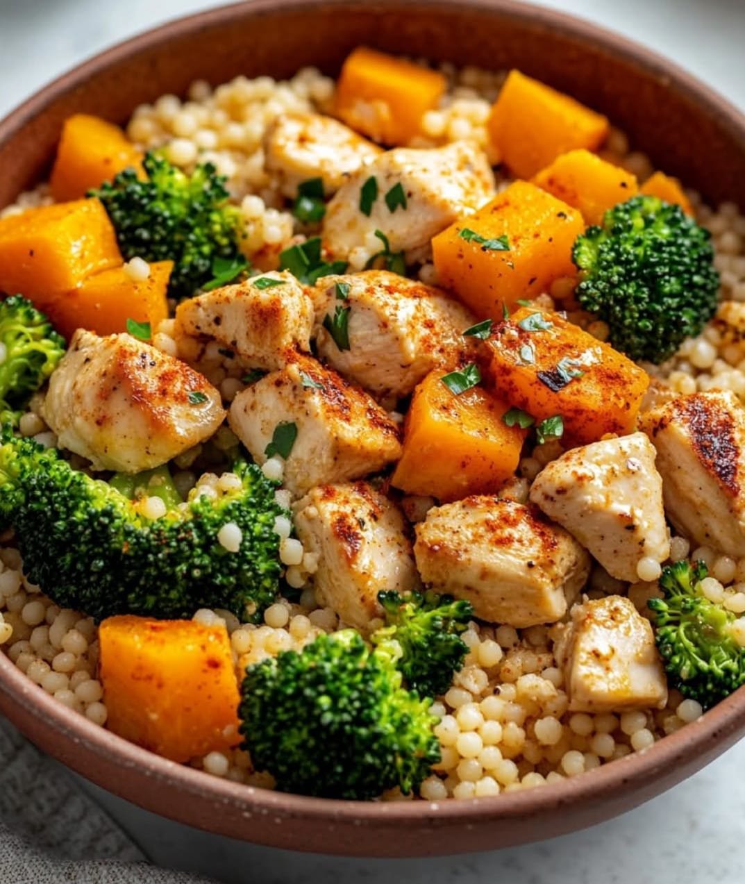 This Chicken and Couscous Bowl is a hearty, flavorful dish that combines tender chicken, nutty couscous, roasted butternut squash, and tangy feta cheese. The combination of roasted vegetables, protein, and a light, fresh dressing makes it the perfect meal for lunch, dinner, or meal prep. The sweetness of the butternut squash complements the savory chicken and feta, while the couscous adds a satisfying texture.