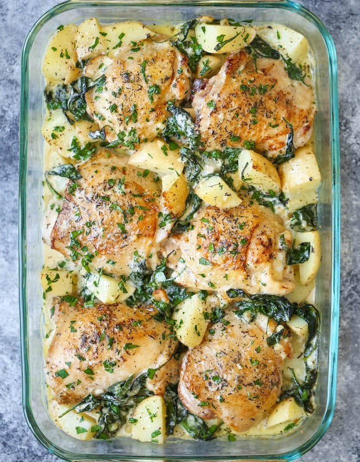 - Place chicken in a single layer into the prepared baking dish. Top with potatoes, spinach and cream sauce.