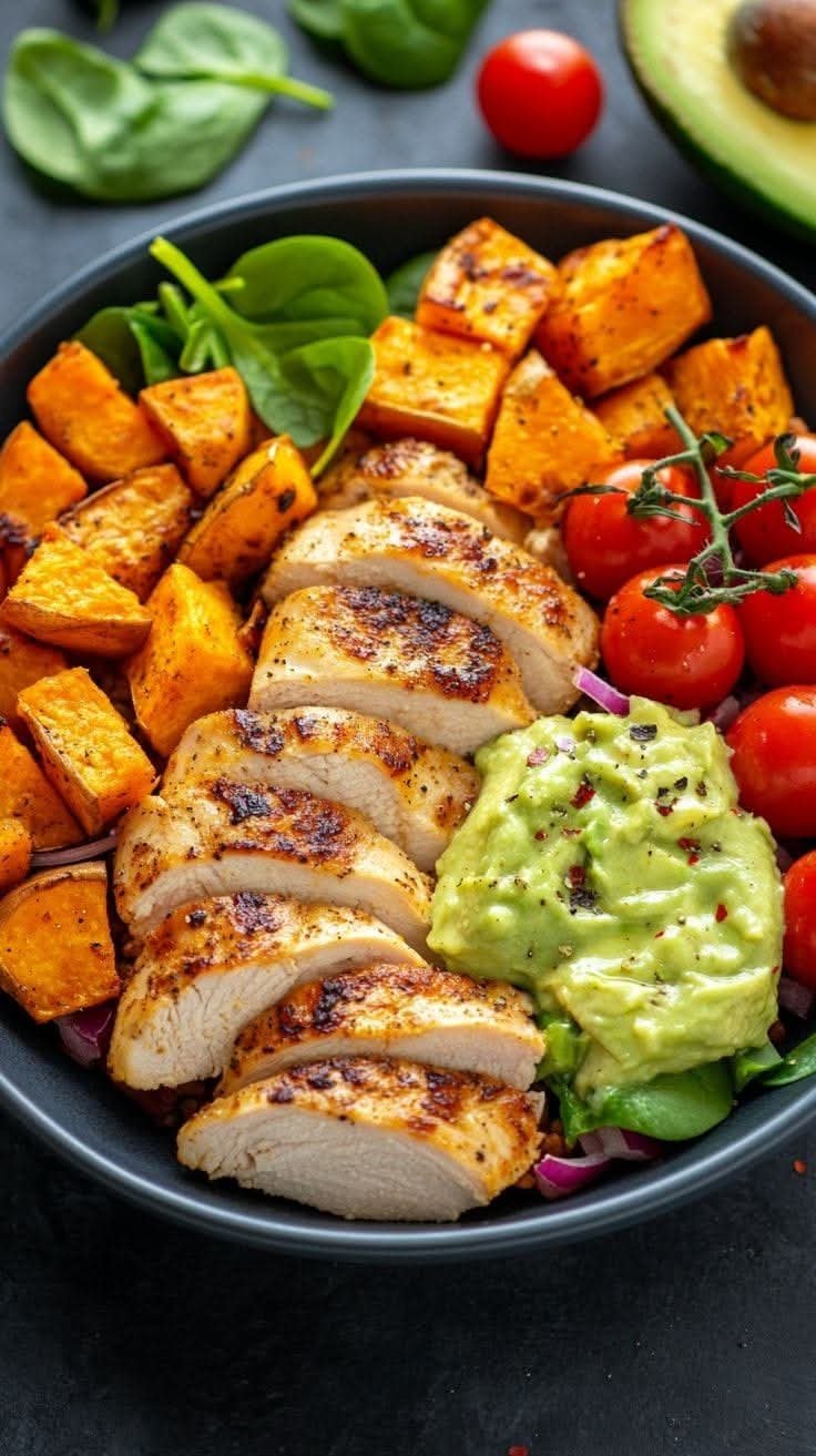 These Chicken and Sweet Potato Bowls are the ultimate wholesome and flavorful meal. Featuring roasted spiced sweet potatoes, juicy grilled or sauteed chicken, and a variety of customizable toppings over fluffy rice or greens—this bowl is hearty, balanced, and perfect for meal prep or a clean dinner. The natural sweetness of the sweet potatoes pairs beautifully with smoky spices and savory chicken.