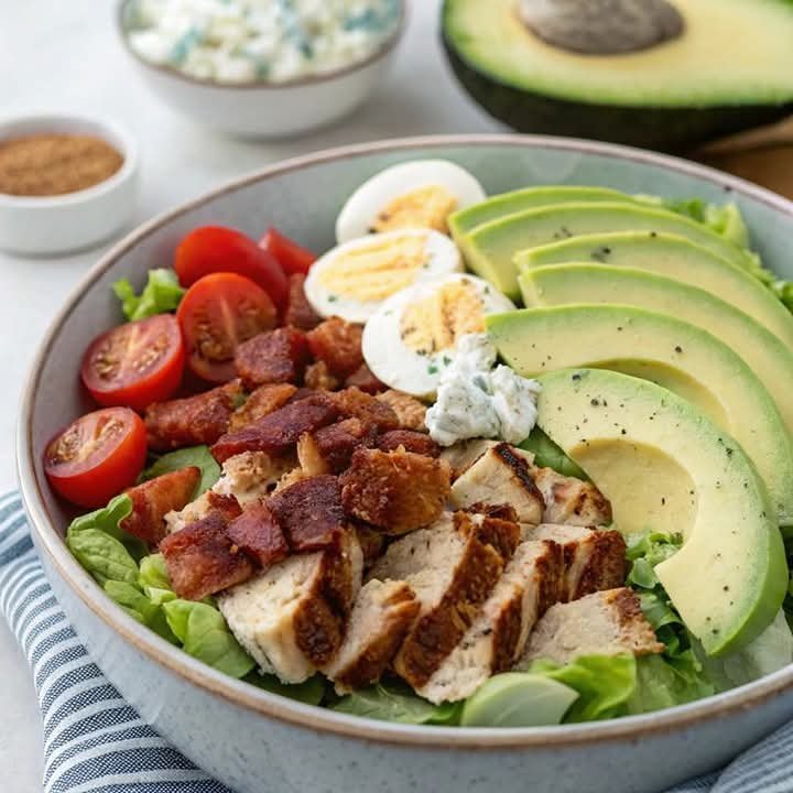 This Chicken Avocado Cobb Salad is a hearty, protein-packed twist on the classic Cobb salad. It features juicy grilled chicken, creamy avocado, crispy bacon, tangy blue cheese, hard-boiled eggs, and fresh vegetables all layered on a bed of greens. Topped with a simple homemade vinaigrette, this salad is perfect as a satisfying lunch or dinner.