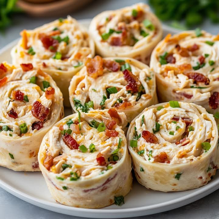Chicken Bacon Ranch Pinwheels are savory, creamy, and packed with flavor. They’re made by mixing cooked chicken, crispy bacon, cream cheese, shredded cheese, and ranch seasoning, then rolling it all up in soft tortillas and slicing them into bite-sized pieces. Perfect for parties, lunches, or easy snacks!