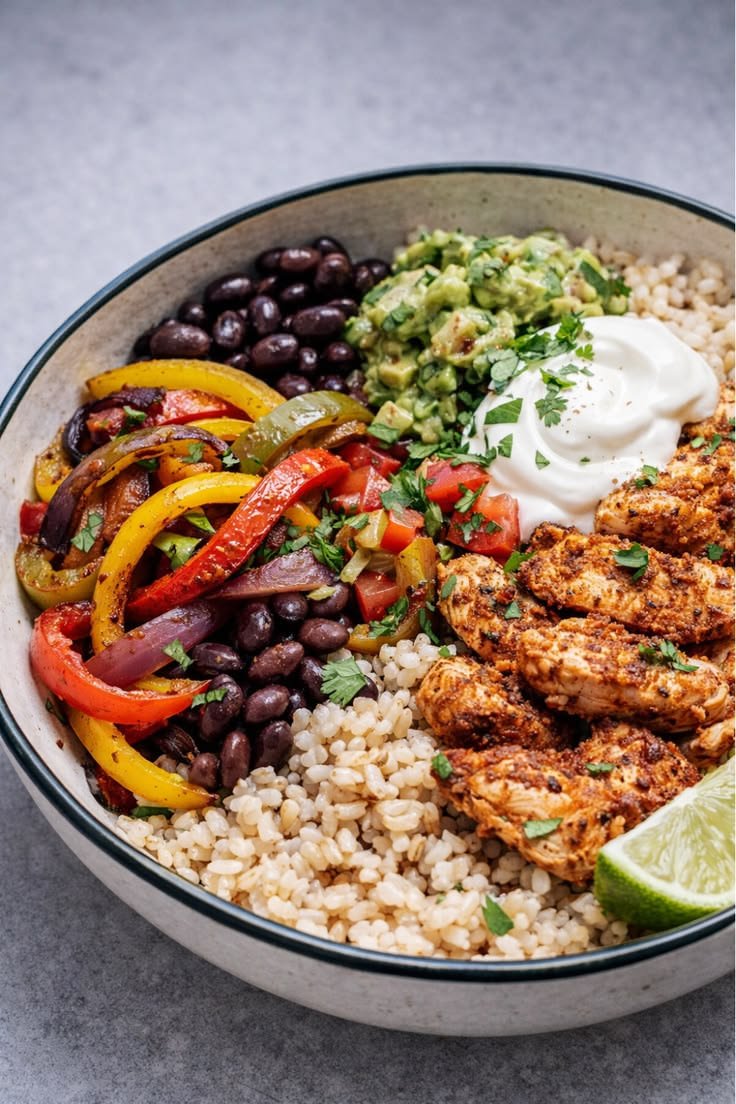 This Chicken Burrito Power Bowl is a colorful, balanced meal packed with protein, fiber, and fresh vegetables. It features seasoned Chicken, hearty Black Beans, creamy Avocado, sautéed peppers and onions, grains, and a cool yogurt or sour cream topping.