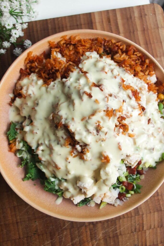 Golden crispy rice layered with juicy seasoned chicken, crisp romaine, and a lighter Caesar-style dressing.