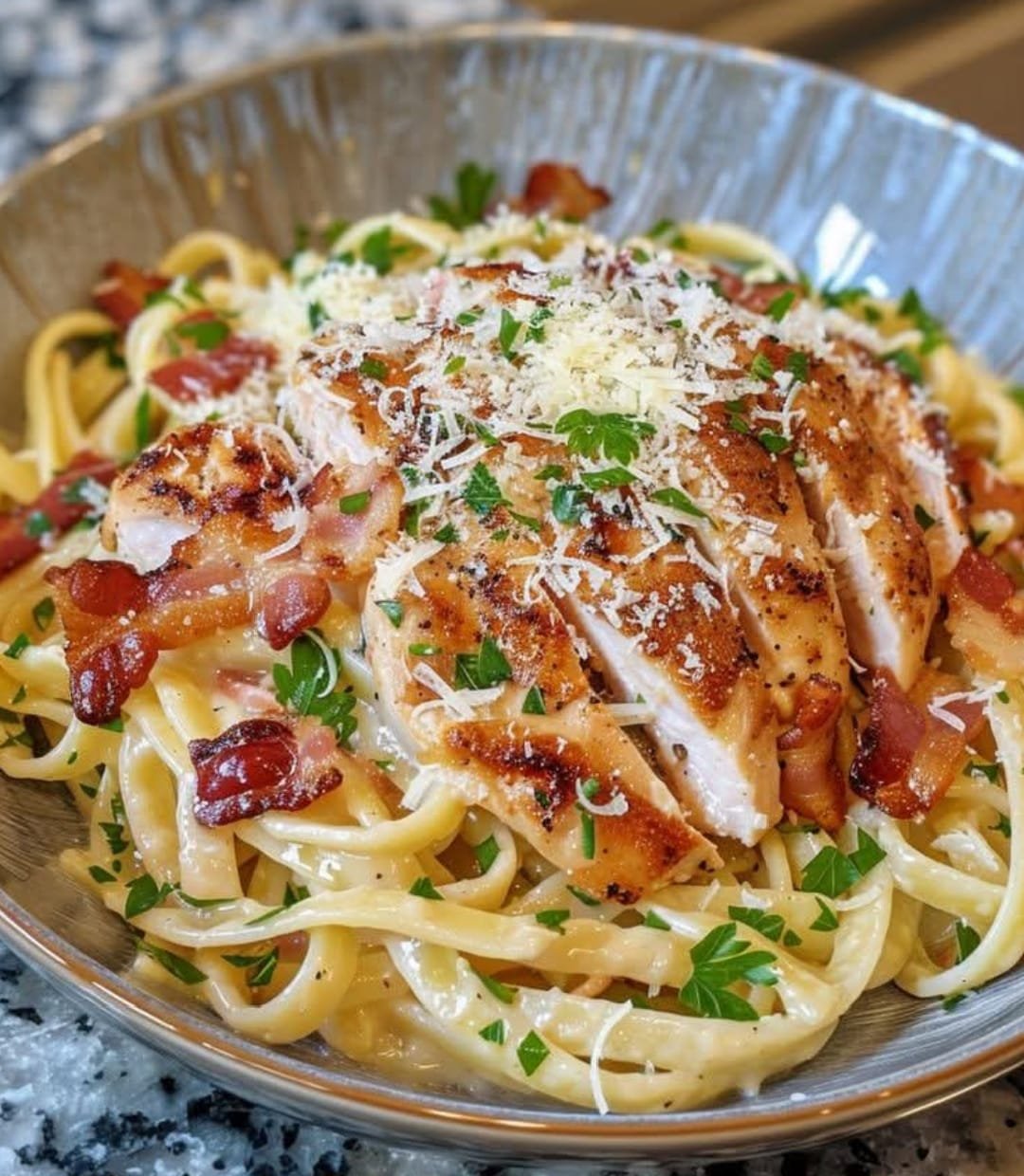 Chicken Carbonara is a creamy, indulgent Italian pasta dish made with tender chicken, crispy pancetta (or bacon), eggs, Parmesan cheese, and black pepper. It’s a rich and satisfying meal that comes together quickly, making it perfect for a weeknight dinner or special occasion.