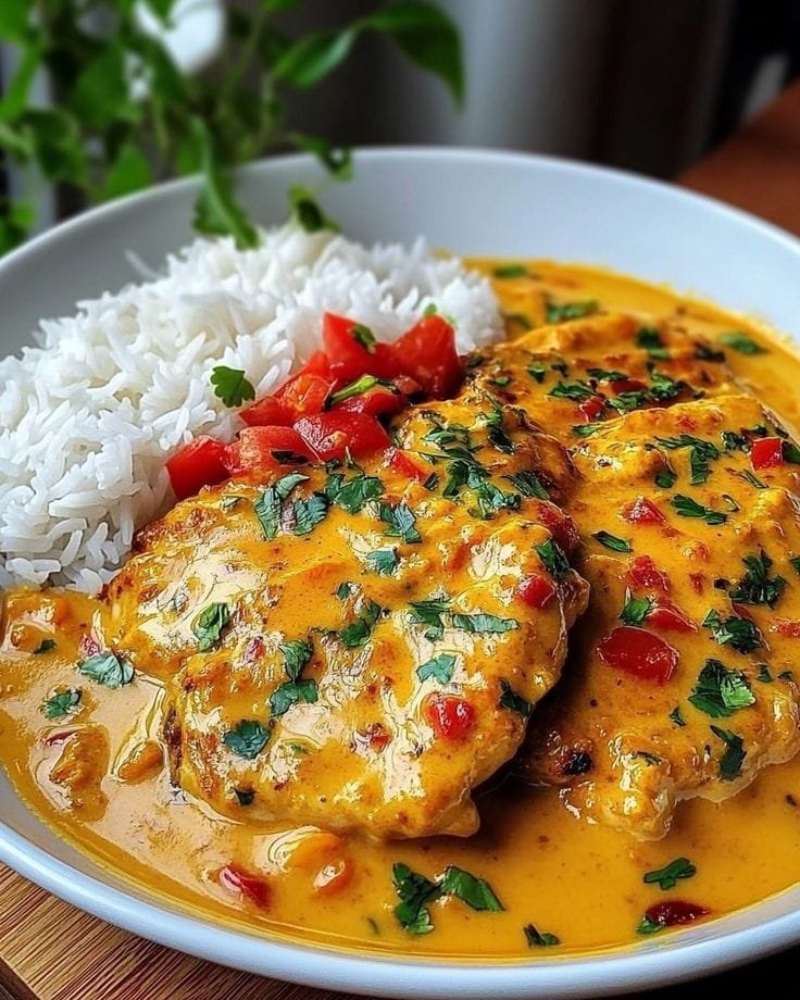 This dish features pan-seared chicken cutlets simmered in a creamy coconut milk curry sauce, infused with garlic, ginger, onions, and aromatic spices. It’s a quick one-pan meal with bold flavors, perfect for weeknight dinners. The balance of spice, richness, and freshness makes this a family favorite across cultures.