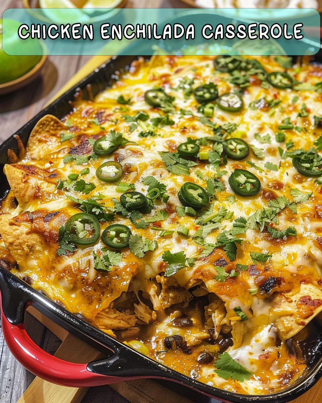 - Chicken Enchilada Casserole is a recipe that is both substantial and tasty. It is a dish that combines together the amazing flavours of classic enchiladas in a simple structure that can be baked and served. This casserole is likely to be a favourite on any occasion, whether you are preparing it for a supper with your family or for a gathering. Take pleasure in the layered flavours and textures that combine to create a meal that is so very fulfilling.