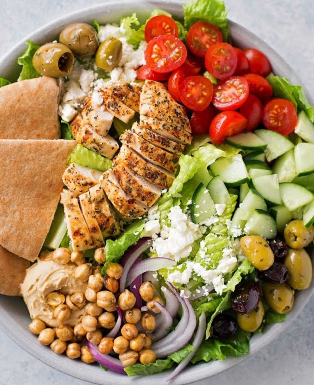 Top with sliced chicken, crumbled feta, and a generous dollop of tzatziki.