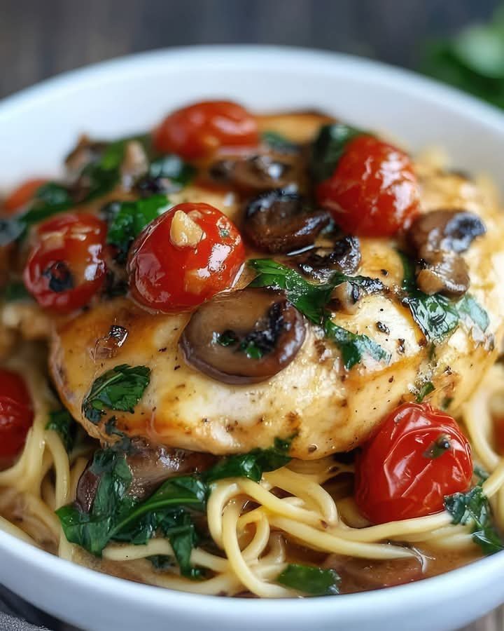7. Toss the cooked pasta with the sauce and place the chicken on top. Garnish with parsley and serve immediately.