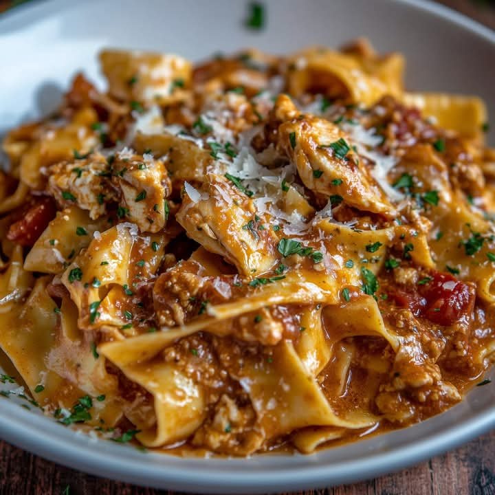 Chicken Pappardelle is a rustic and comforting Italian pasta dish that features wide ribbons of pappardelle pasta coated in a creamy garlic-parmesan sauce, tender sautéed chicken, and a blend of herbs and vegetables. This dish is rich, satisfying, and perfect for a cozy dinner.