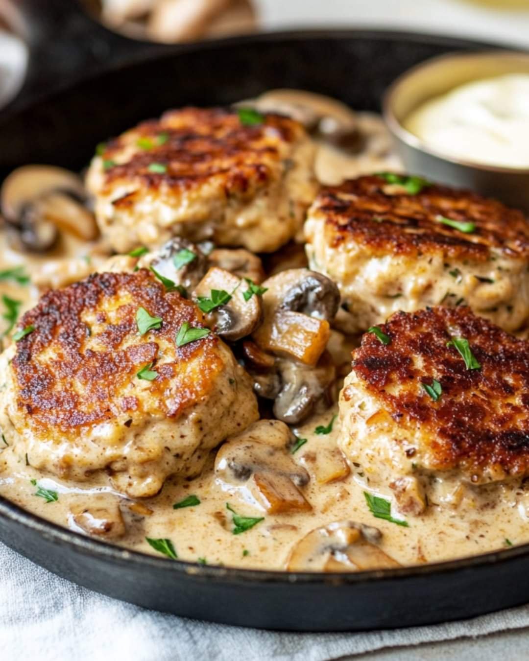 Chicken Patties in Creamy Mushroom Sauce is a comforting and flavorful dish featuring tender, homemade chicken patties served in a rich and savory mushroom sauce. The chicken patties are made from ground chicken, seasoned and pan-fried to a golden brown, and then smothered in a creamy, herb-infused mushroom sauce. This hearty dish is perfect for a family dinner, combining the juicy chicken patties with the earthiness of mushrooms and the indulgence of cream.
