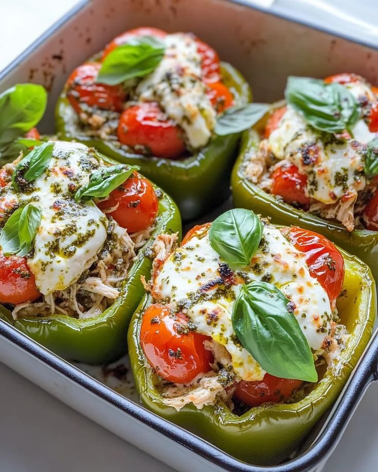 These stuffed peppers combine the best of Italian and Mediterranean flavors — tender bell peppers filled with juicy chicken, creamy mozzarella, basil pesto, and cherry tomatoes. It’s light yet satisfying, perfect for a healthy dinner or meal prep option.
