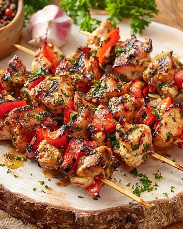 Alternate marinated chicken, sausage slices, bell peppers, onion, and cherry peppers on each skewer.