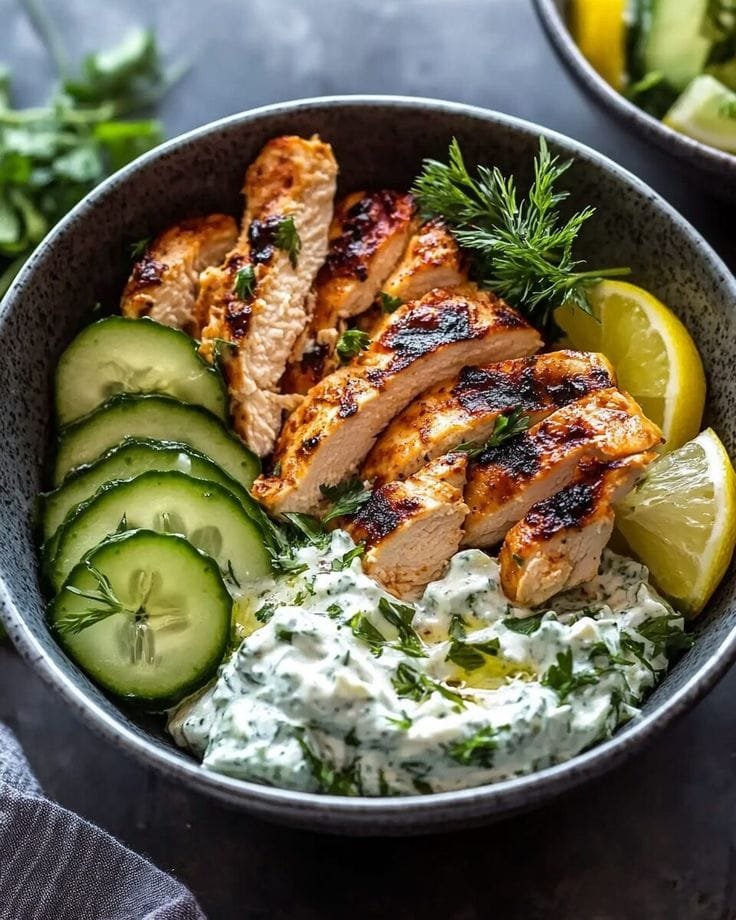 The Chicken Tzatziki Bowl is a vibrant Mediterranean-inspired dish featuring juicy grilled chicken, fluffy rice or quinoa, crisp vegetables, and a creamy homemade tzatziki sauce. It’s a refreshing, satisfying, and wholesome meal that’s perfect for lunch or dinner—and great for meal prep.