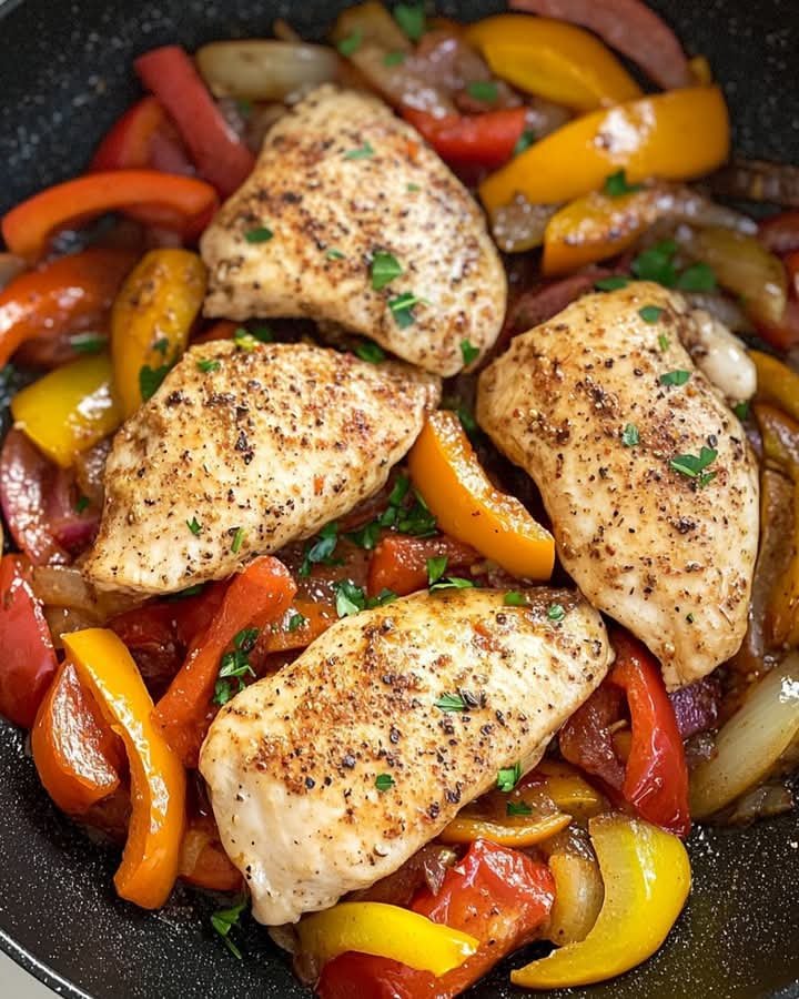 This Chicken with Bell Peppers and Onion dish is a colorful, healthy, and quick one-pan meal. The savory chicken is sautéed with sweet bell peppers and tender onions in a simple blend of herbs, spices, and olive oil. It’s perfect served over rice, in tacos, or on its own for a low-carb option. Ideal for weeknight dinners, this meal is rich in lean protein and vitamins.