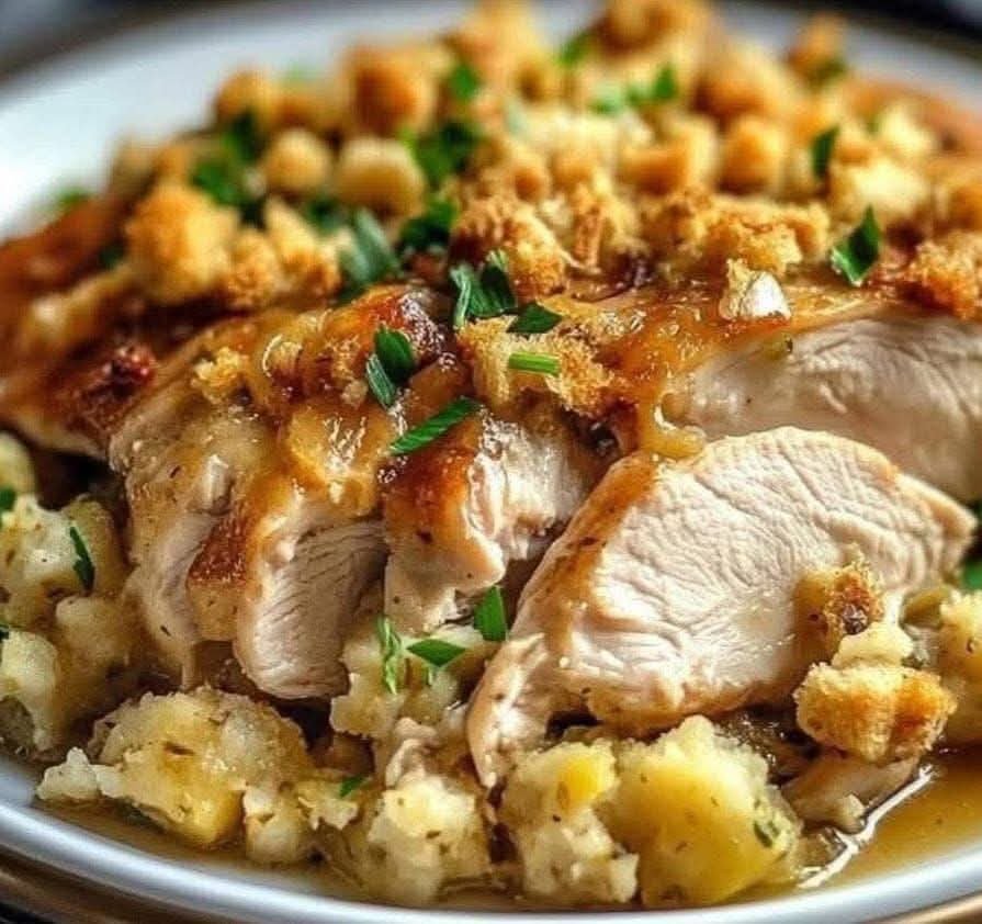 Chicken with Stuffing and Gravy is the ultimate comfort food, combining tender roasted chicken, savory bread stuffing, and luscious gravy for a meal that feels both hearty and homey. Its versatility allows for simple weeknight dinners or impressive holiday spreads, while the components can be customized to personal taste with herbs, add-ins, and cooking techniques. Proper preparation—ensuring the chicken remains juicy, the stuffing flavorful, and the gravy rich—makes this dish a standout centerpiece. Served with seasonal vegetables or mashed potatoes, it provides a complete, satisfying meal. This classic recipe embodies homestyle cooking at its finest, delivering warmth, flavor, and tradition in every bite.