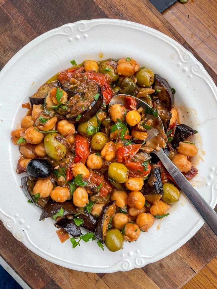 A plant-based twist on classic Sicilian caponata, combining eggplant, bell peppers, tomatoes, olives, capers, and chickpeas for a nutrient-rich, tangy, and savory dish. Serve warm, at room temperature, or over grains for a complete Mediterranean meal.