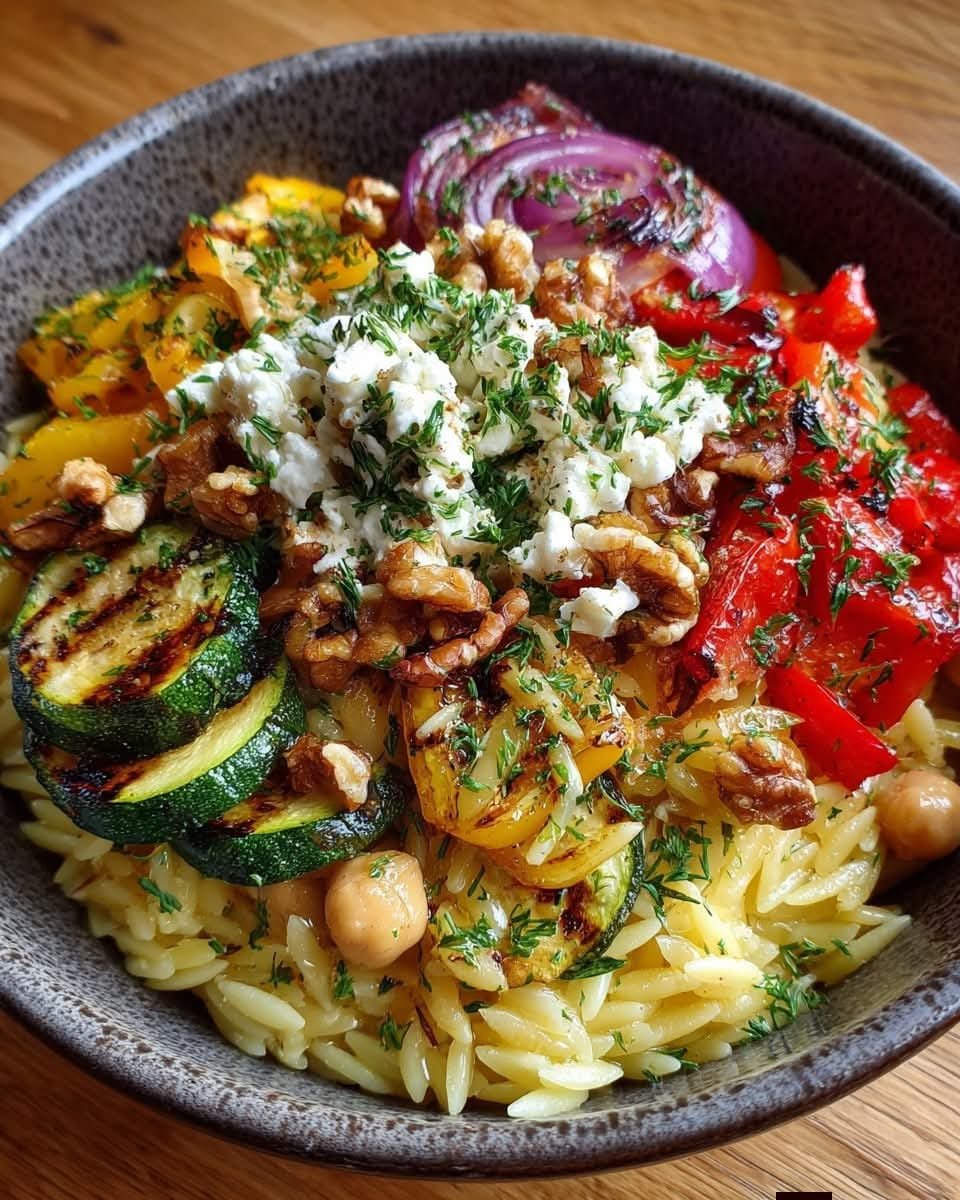 This Mediterranean-style bowl is built on tender orzo pasta and protein-packed chickpeas, topped with sweet roasted vegetables, salty feta, and crunchy walnuts. A light lemon-Dijon dressing ties everything together, making every bite bright and satisfying. It’s naturally vegetarian, full of fiber, and great warm or at room temperature — perfect for busy days or sharing at gatherings.