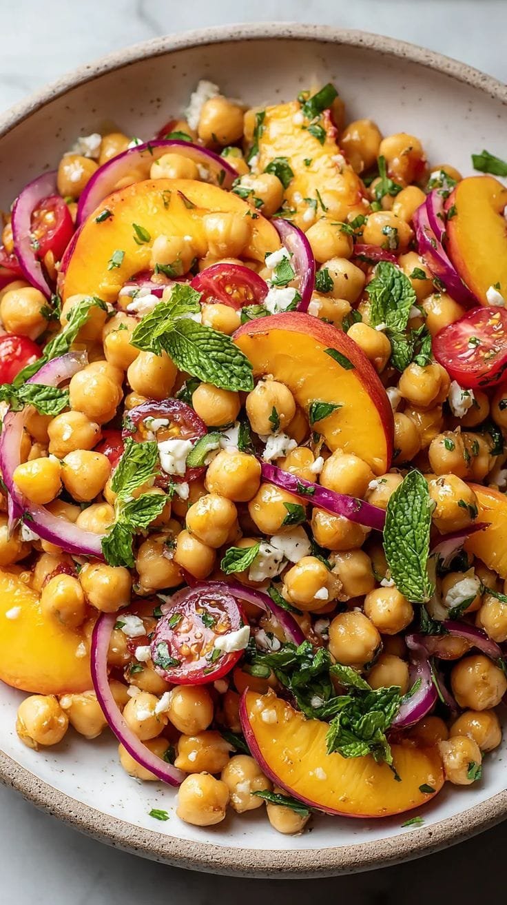 This vibrant salad combines juicy peaches, hearty chickpeas, and fresh herbs with a bright honey-lime dressing. It’s a Mediterranean-friendly dish perfect for warm weather — full of fiber, plant-based protein, and antioxidants. Serve it as a side dish or a light main meal.