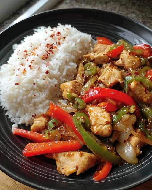 Chili Garlic Chicken with Peppers & Steamed Rice
