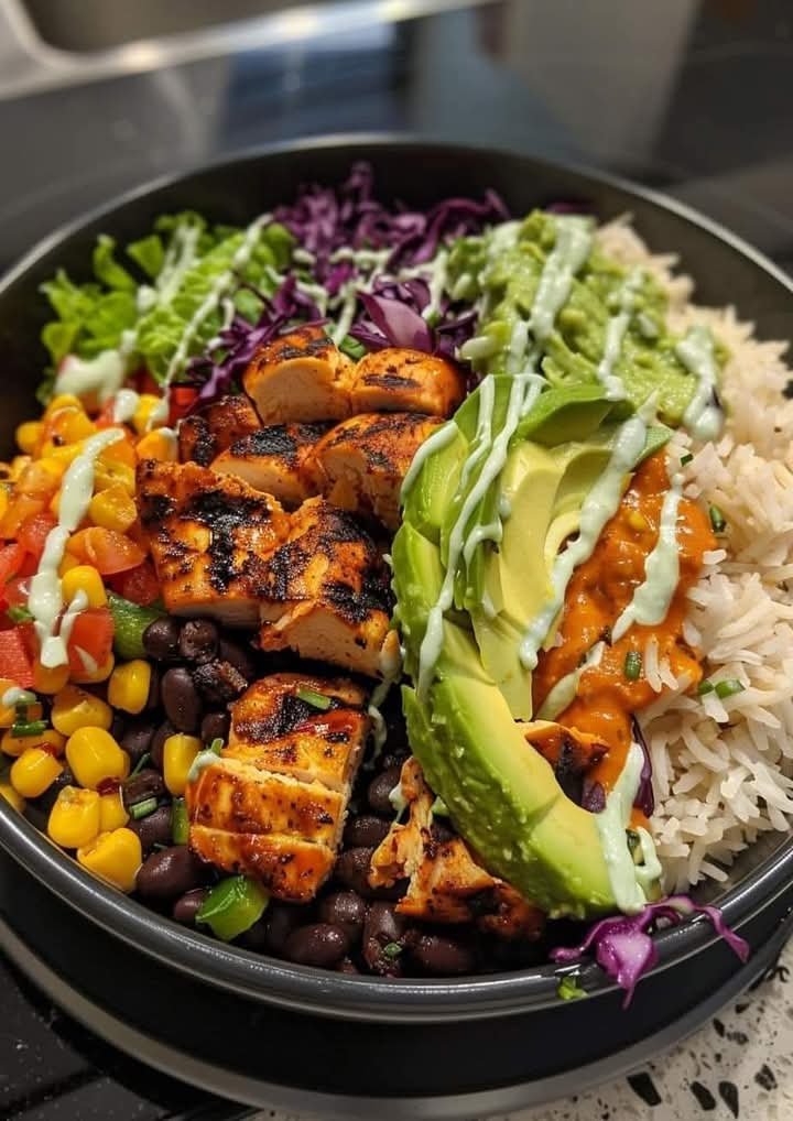 - Layer on black beans, corn, shredded lettuce, diced tomatoes, and avocado slices.