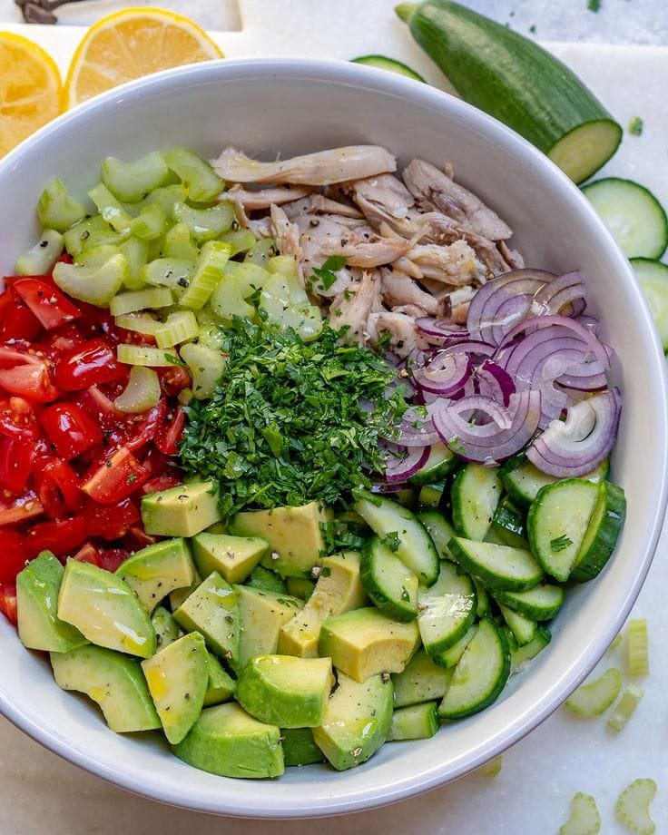 This vibrant salad features juicy chopped chicken breast, creamy avocado, crisp cucumbers, cherry tomatoes, and red onion, all tossed in a zesty lemon-garlic vinaigrette. It’s hearty, healthy, low-carb, and perfect for lunch, dinner, or meal prep. Naturally gluten-free and easily customizable!