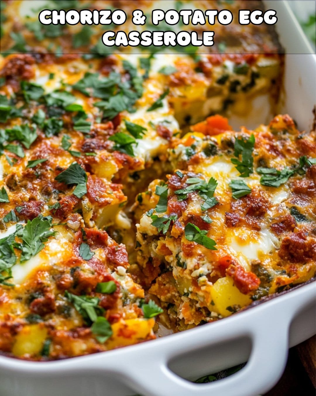 - Evenly distribute the chorizo and vegetable mixture in the bottom of the baking dish that has been prepared.