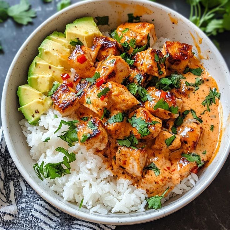 This Coconut Chicken Rice Bowl is packed with tender, juicy chicken simmered in a rich coconut milk sauce with garlic, ginger, and lime. Served over fluffy jasmine rice with fresh veggies or herbs, it’s simple comfort with vibrant flavor — all in one bowl!