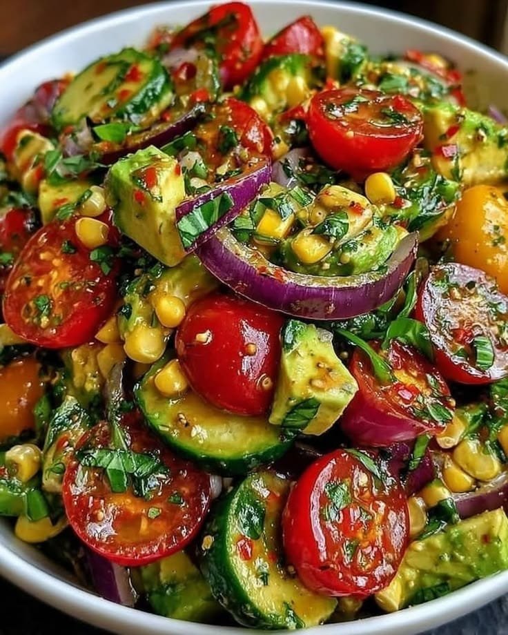 This colorful avocado salad is a refreshing, nutrient-packed dish bursting with vibrant vegetables and zesty flavors. Creamy avocado pairs beautifully with juicy cherry tomatoes, crisp cucumbers, sweet corn, and tangy dressing. Perfect for summer lunches, side dishes, or light dinners, this salad is quick to prepare and loaded with vitamins, healthy fats, and fiber.